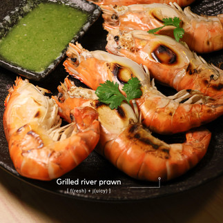 🦐 Grilled River Prawn – กุ้งแม่น้ำย่าง เนื้อแน่น หวานฉ่ำ เสิร์ฟพร้อมน้ำจิ้มซีฟู้ด